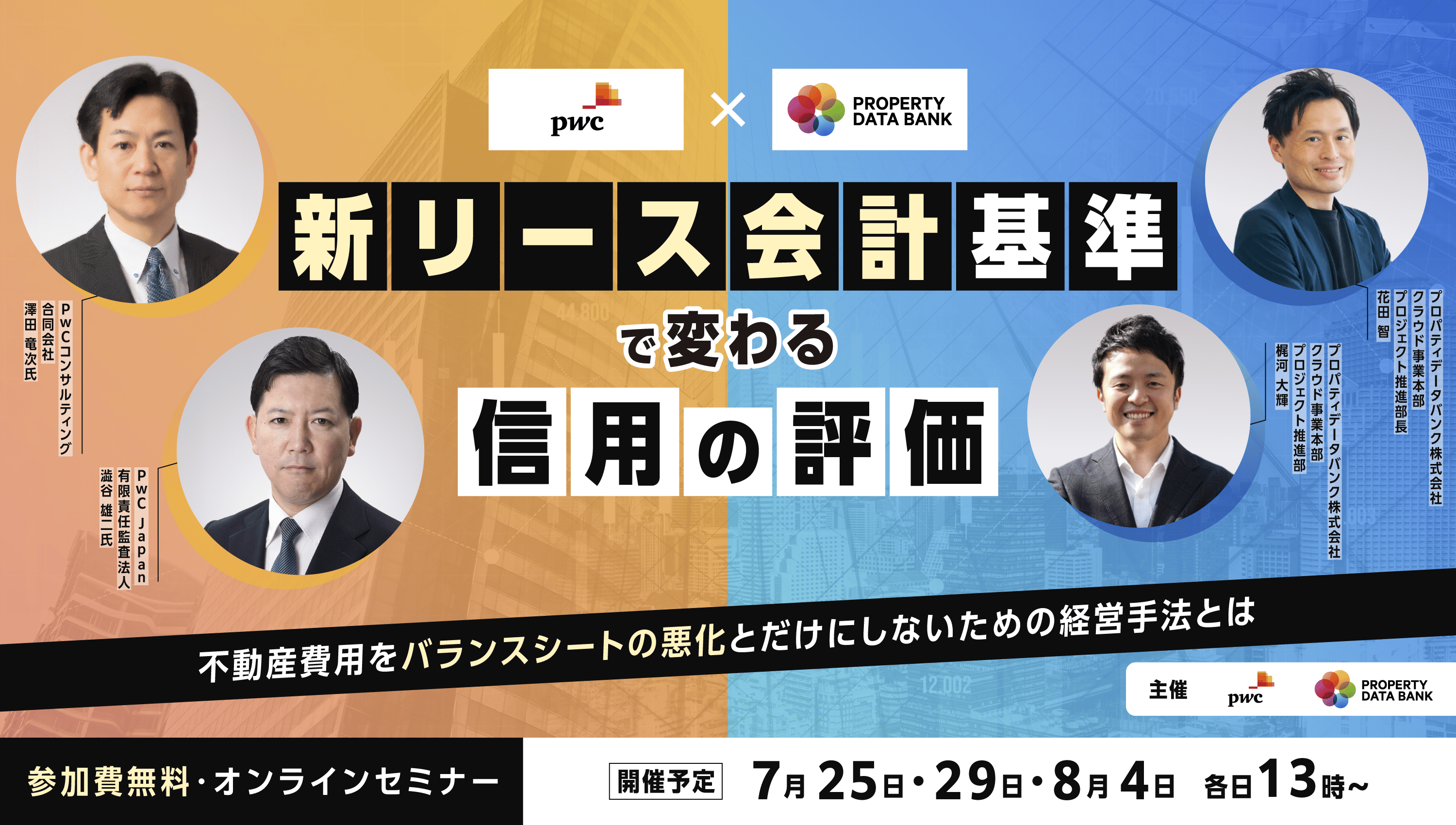 本セミナーでは、企業不動産(CRE)活用のプロフェッショナル=プロパティデータバンクと、会計・監査・IR支援の最前線に立つPwC が、戦略/実務/IRの3視点から、影響とその対処法を具体的に解説します。